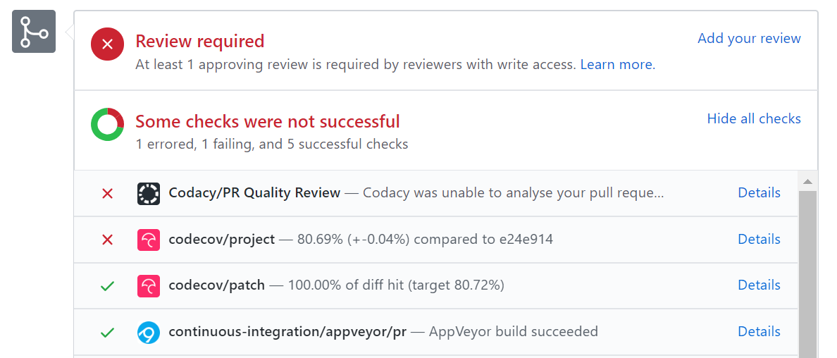 Require status checks to pass before mergingto ensure that a branch has to pass CI before it can be merged into themasterbranch - If you think all PRs should be reviewed by someone other than the PR author before they are merged, also tick the