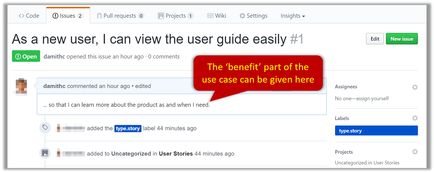 - Record each of the user stories you plan to deliver as an issue in the issue tracker. e.g.,