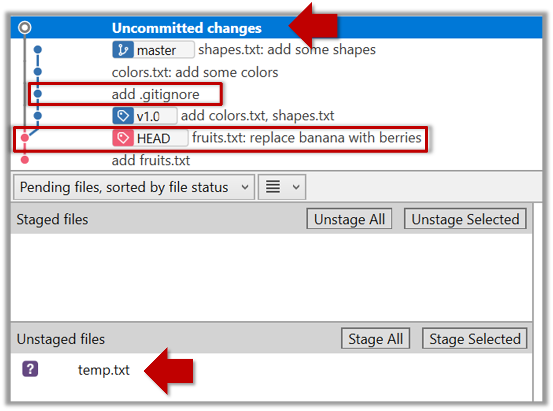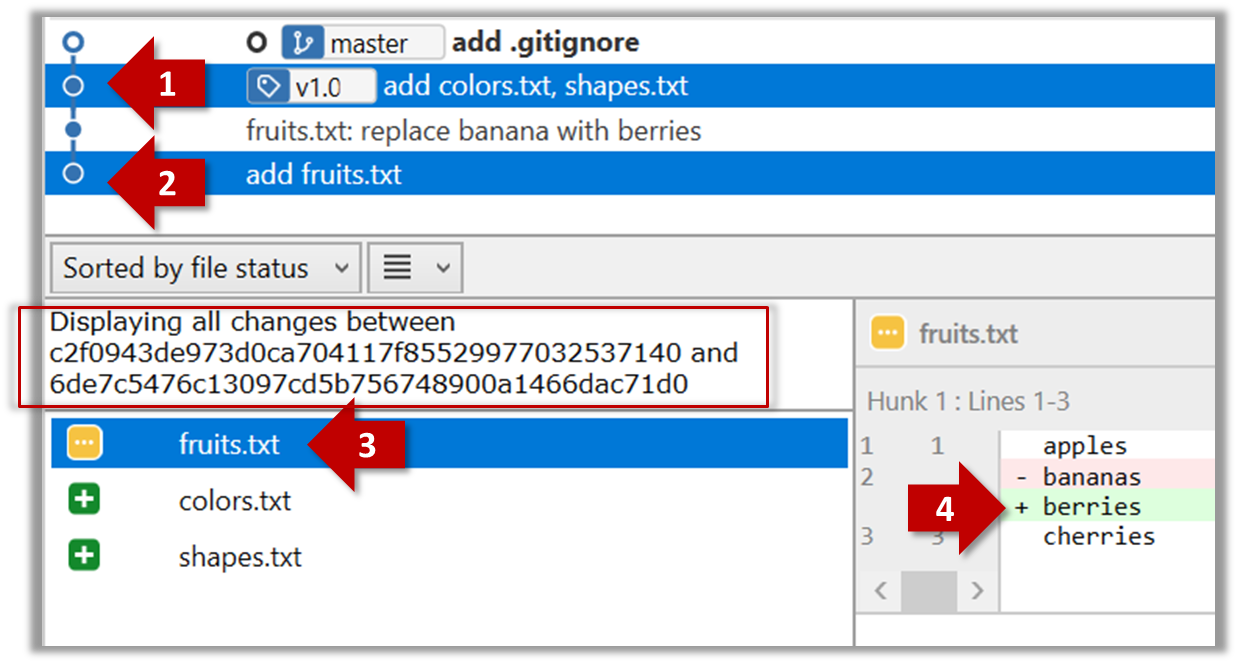 The same method can be used to compare the current state of the working directory (which might have uncommitted changes) to a point in the history.