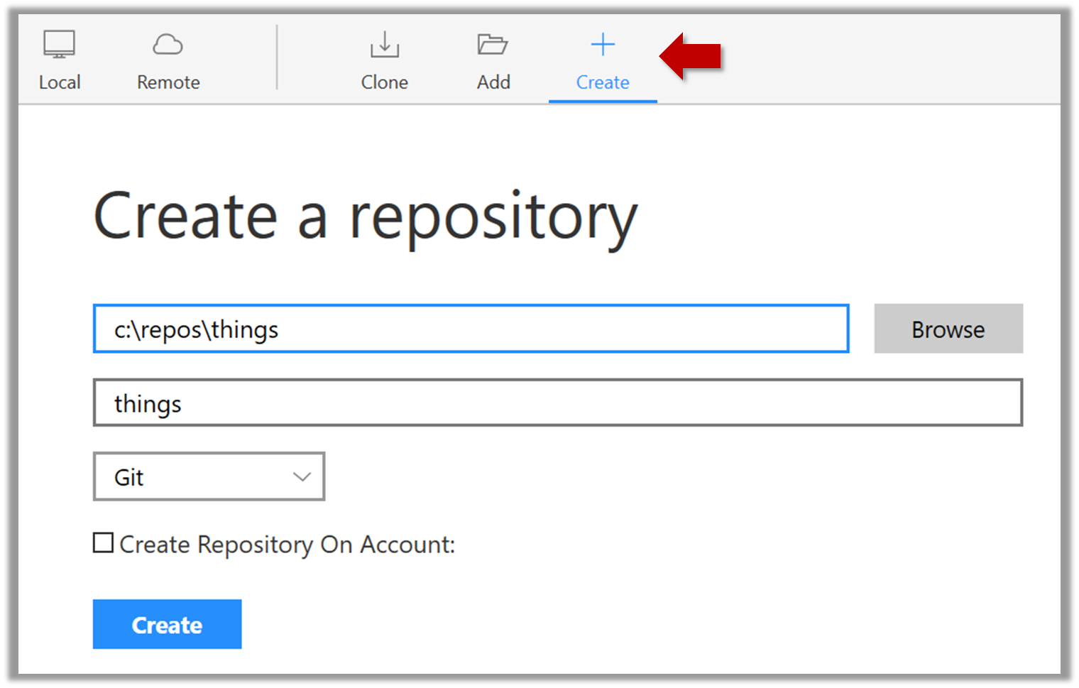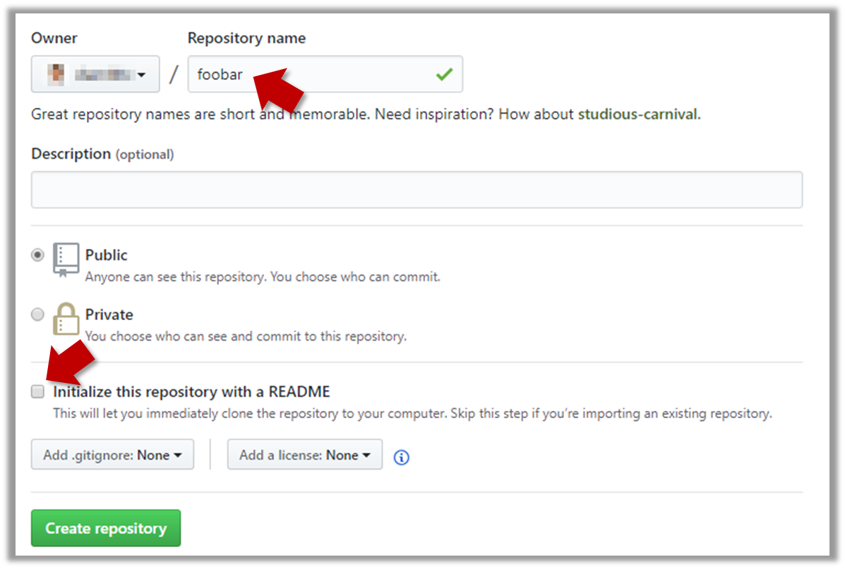 In the next screen, provide a name for your repo but keep the Initialize this repo ... tick box unchecked.