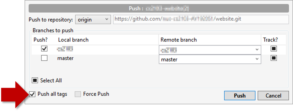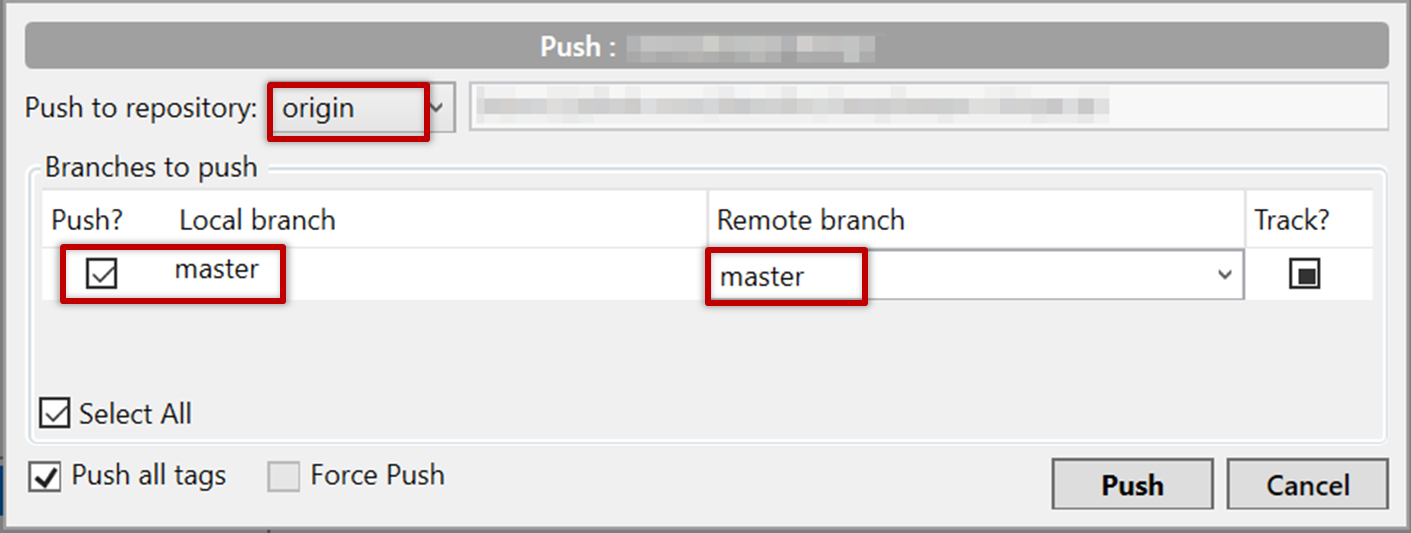 Click the Push button on the main menu, ensure the settings are as follows in the next dialog, and click the Push button on the dialog.
