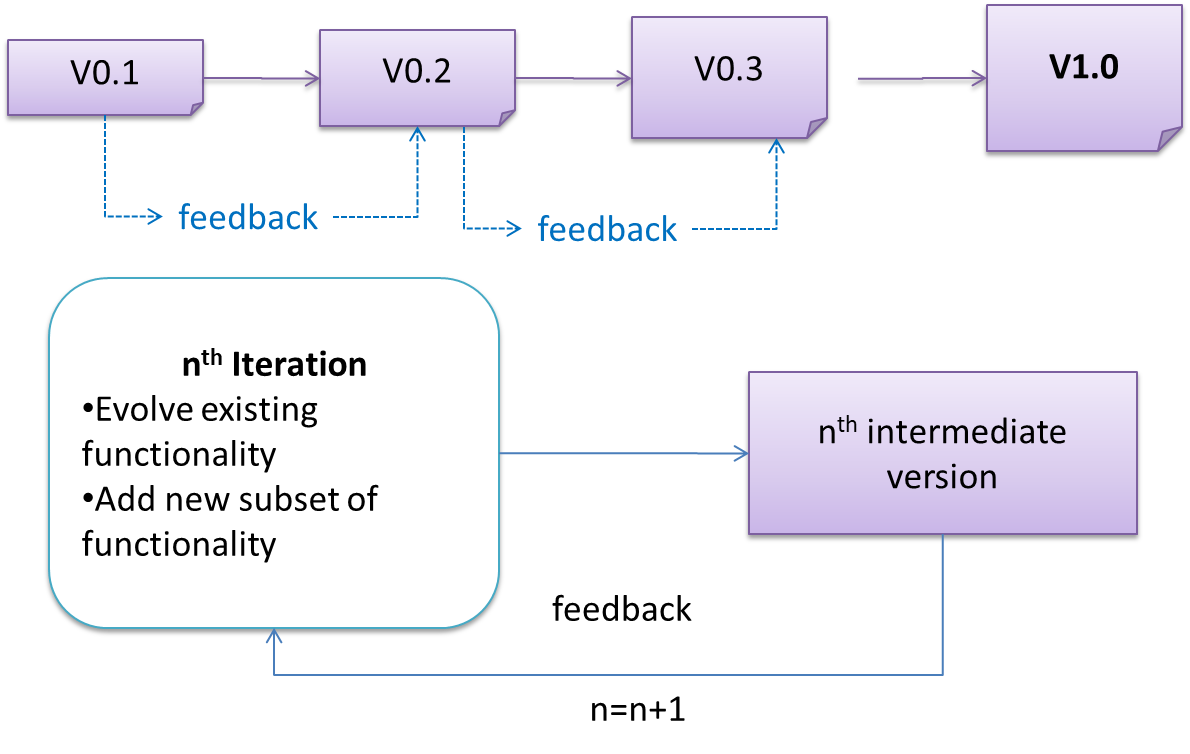 In this model, each of the iterations produces a new version of the product. Feedback on the new version can then be fed to the next iteration. Taking the Minesweeper game as an example, the iterative model will deliver a fully playable version from the early iterations. However, the first iteration will have primitive functionality, for example, a clumsy text based UI, fixed board size, limited randomization, etc. These functionalities will then be improved in later releases.