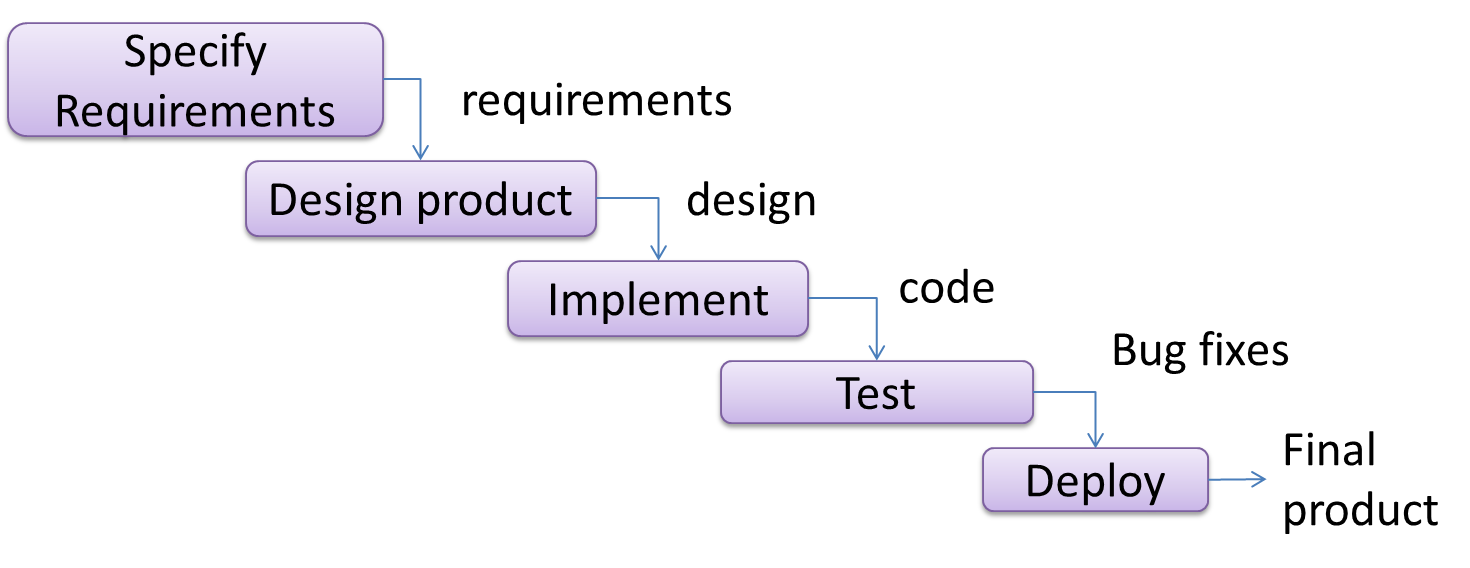 The sequential model, also called the waterfall model, models software development as a linear process, in which the project is seen as progressing steadily in one direction through the development stages. The name waterfall stems from how the model is drawn to look like a waterfall (see below).