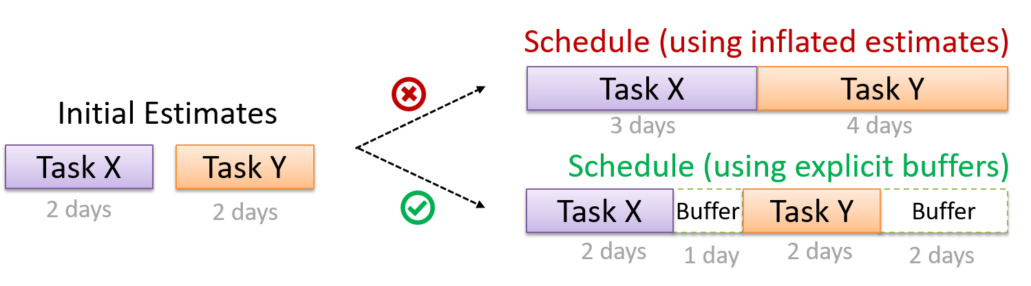 A buffer is time set aside to absorb any unforeseen delays. It is very important to include buffers in a software project schedule because effort/time estimations for software development are notoriously hard. However, do not inflate task estimates to create hidden buffers; have explicit buffers instead. Reason: With explicit buffers, it is easier to detect incorrect effort estimates which can serve as feedback to improve future effort estimates.