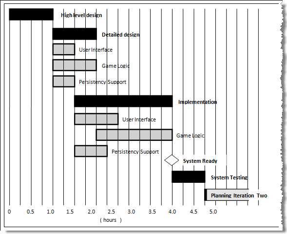 In a Gantt chart, a solid bar represents the main task, which is generally composed of a number of subtasks, shown as grey bars. The diamond shape indicates an important deadline/deliverable/milestone.