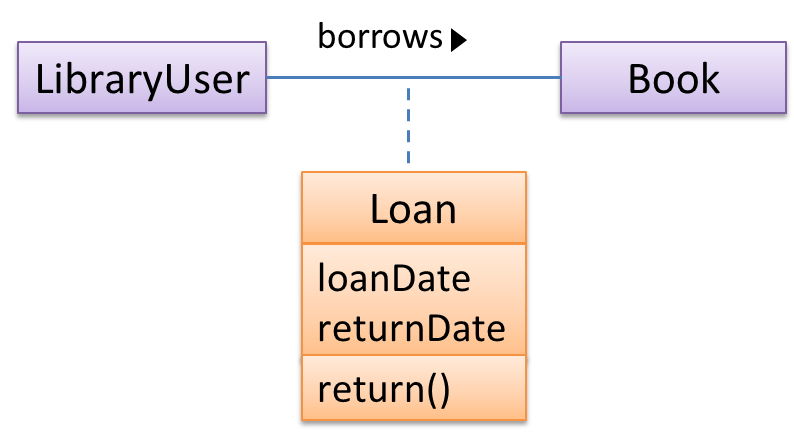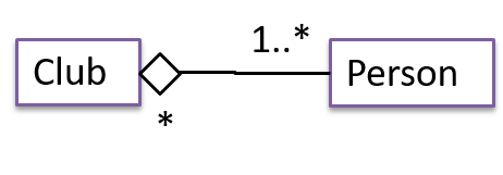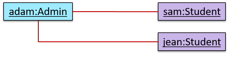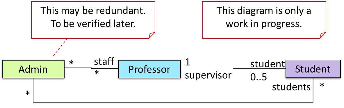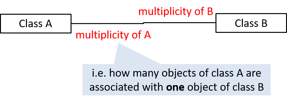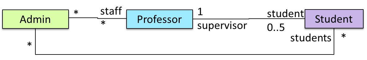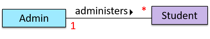 0..1 : optional, can be linked to 0 or 1 objects.1 : compulsory, must be linked to one object at all times.* : can be linked to 0 or more objects.n..m : the number of linked objects must be within n to m inclusive. In the diagram below, an Admin object administers (is in charge of) any number of students but a Student object must always be under the charge of exactly one Admin object.