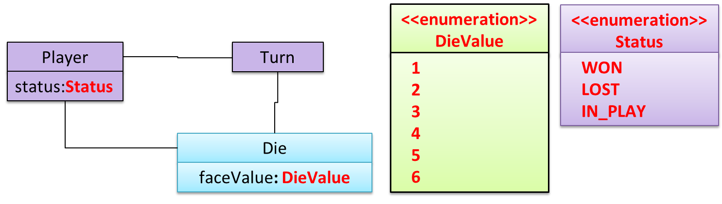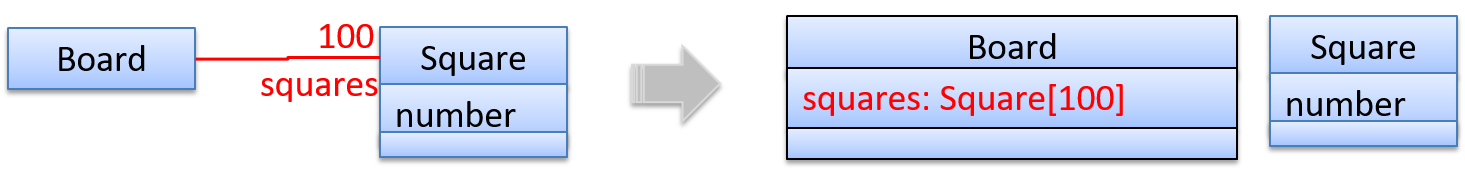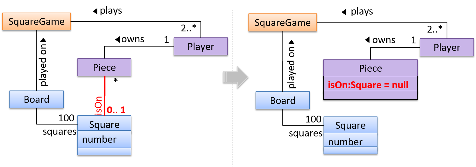 A Piece may or may not be on a Square. Note how that association can be replaced by an isOn attribute of the Piece class. The isOn attribute can either be null or hold a reference to a Square object, matching the 0..1 multiplicity of the association it replaces. The default value is null.