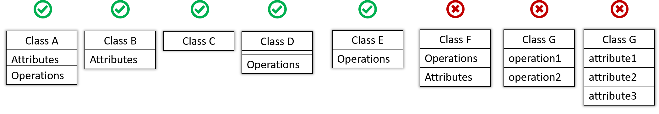 The 'Operations' compartment and/or the 'Attributes' compartment may be omitted if such details are not important for the task at hand. 'Attributes' always appear above the 'Operations' compartment. All operations should be in one compartment rather than each operation in a separate compartment. Same goes for attributes.