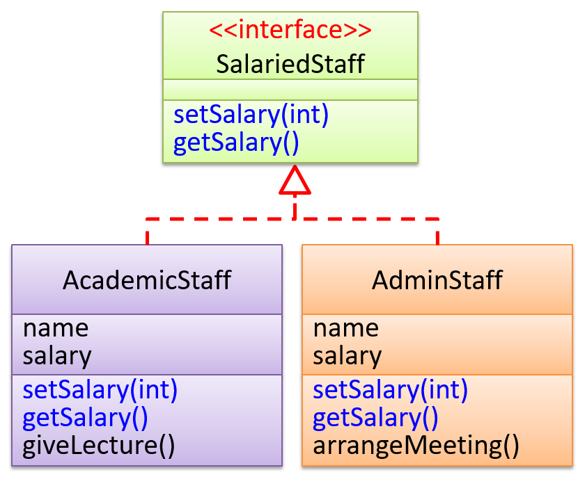 The AcademicStaff and the AdminStaff classes implement the SalariedStaff interface.