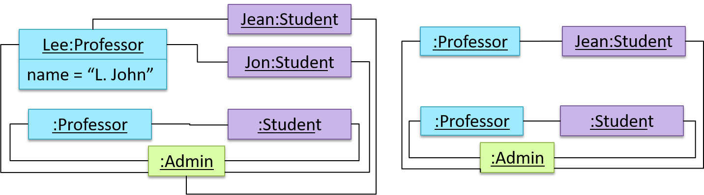 Both object diagrams are derived from the same class diagram shown earlier. In other words, each of these object diagrams shows ‘an instance of’ the same class diagram.