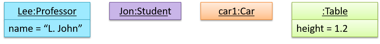 car1:Car are underlined.objectName:ClassName is meant to say 'an instance of ClassName identified as objectName'.:Car which is meant to say 'an unnamed instance of a Car object'.Some example objects: