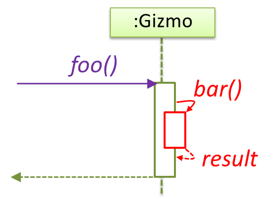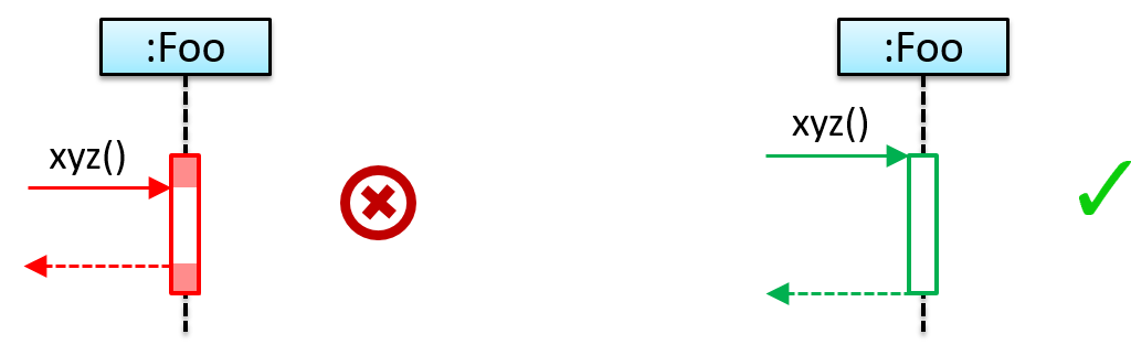 [Common notation error] Activation bar too long: The activation bar of a method cannot start before the method call arrives and a method cannot remain active after the method has returned. In the two sequence diagrams below, the one on the left commits this error because the activation bar starts before the method Foo#xyz() is called and remains active after the method returns.