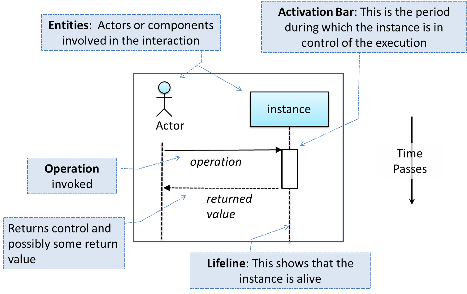 To reduce clutter, activation bars and return arrows may be omitted if they do not result in ambiguities or loss of i.e., information relevant to the purpose of the diagramrelevant information. Informal operation descriptions such as those given in the example below can be used, if more precise details are not required for the task at hand.