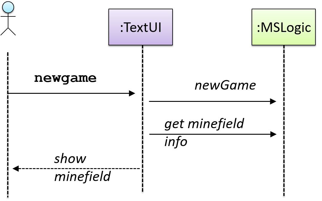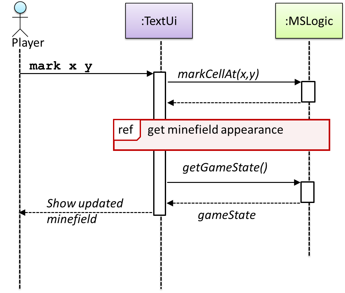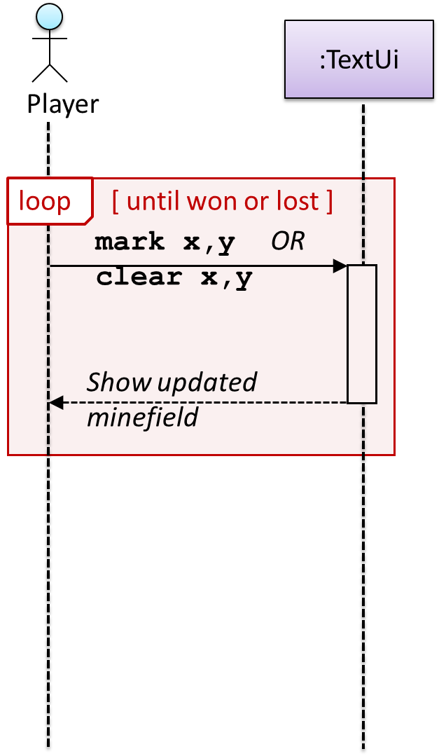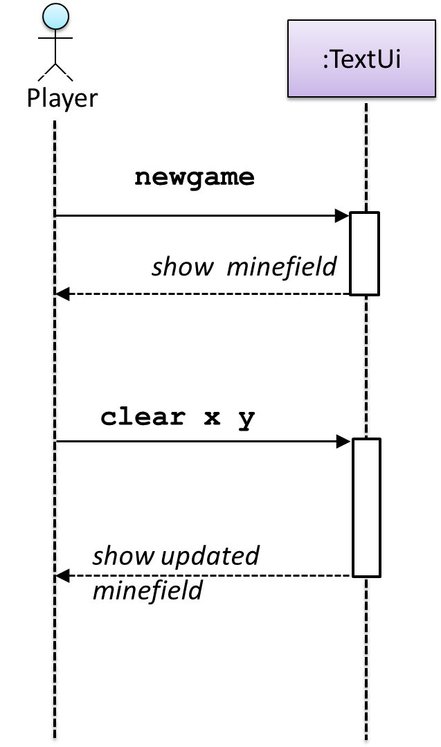 This sequence diagram shows some interactions between a human user and the Text UI of a Command Line InterfaceCLI Minesweeper game.