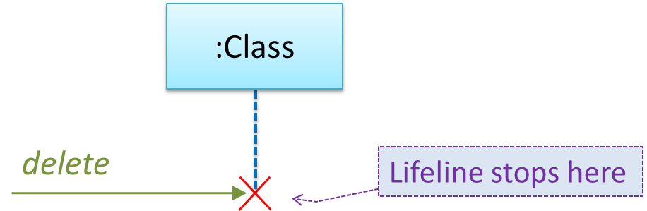 Although object deletion is not that important in languages such as Java that support automatic memory management, you can still show object deletion in UML diagrams to indicate the point at which the object ceases to be used.